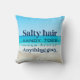 Beach saying throw pillow for anyone who loves the coastal life and spending time on the ocean. Beach photo background and typography design that reads - Salty hair, sandy toes, ocean breeze, anything goes. Design is repeated on both sides.