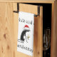 Here's that party guy again, the Cabernet Cat, with his Santa Claus hat and his glass of wine, this time a white instead of a Cabernet, because today it's all about Chardonnay (hey hey)! Say it with him: Saluté and a Chardonnay! A funny wine quote heard often at Christmas holiday parties. Here the design can be seen on a fun kitchen towel, with fun retro text, burgundy star decorations, and the black cartoon cat himself, dressed for the season in a red hat with fuzzy white trim.