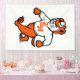 This dynamic design proudly showcases the full-body mascot of Sam Houston State University. The stylized Bearkat is depicted in a powerful, running stance with a determined expression, embodying the team's strength and competitive spirit. It is outfitted in a sweater adorned with the iconic "SH" logo and a paw print, a clear symbol of university pride. This impactful and recognizable design is a perfect way to display allegiance to Sam Houston State University and its athletic teams.