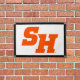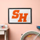 This dynamic design proudly showcases the official "SH" wordmark logo of Sam Houston State University. The bold letters are presented in a powerful, slanted sans-serif typeface, conveying a sense of energy and modernity. This impactful and recognizable design embodies the spirit, pride, and identity of Sam Houston State University, serving as a clear identifier for students, alumni, and supporters.