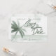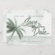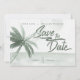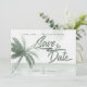 Same Love, Smaller Wedding .. Monochromatic sage green Watercolor Tropical Palm Tree Beach Wedding Save the Date - brush stroke calligraphy highlights this rustic watercolor beach design - coconut palm tree over the ocean with a cloudy sky. Shades of sage green is the monochromatic color giving this invitation a casual rustic appeal.