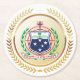 The national seal or coat of arms of Samoa, is set on a white background. The emblem is infused into a faux gold circle shape, and that, in turn, is nestled in the middle of a faux gold laurel wreath.