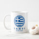 Samos, Greece coffee mug featuring the national flag of Greece inside a Greek blue Aztec circle. This mug is perfect for you to enjoy drinking your coffee while you are on vacation in Samos, Greece or if you are proud to be from Samos.