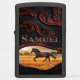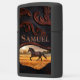 A black horse gallops through a field of tall grass, with the sun setting in the distance. The image is framed by a dark, intricately carved wooden border, with the name Samuel etched across the top.
