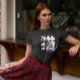 My 11 yo wore adult XL (5’7” 165#). The 8yo is small framed. She wore adult small and tied it in the back. Grandma wore adult large with long sleeve shirt underneath. Tall girl adult medium. Dark haired male adult large. Good quality dark Heather gray, Gildan brand shirt. -it was next up from basic choice and cost about $20 per shirt. Not too thick or thin. Washed and dried well, no major shrinkage. Not see-through. Can wear a bra under it fine. Screen print is just as shown and well done, front and back.
