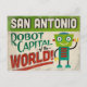 A funny San Antonio Texas vintage travel postcard featuring a friendly robot with fun retro style text that says, "San Antonio, Robot Capital of the world!"