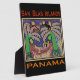 Kuna Indian mola, tropical islands, man in hammock, island monkeys, palm trees, San Blas Islands, Panama, Virginia Vivier, Vagabond Folk Art, black red blue, yellow orange green.
