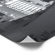 This black and white photograph captures the San Francisco skyline at night. The iconic Transamerica Pyramid stands prominently among other illuminated skyscrapers. The city lights reflect off the water in the background, creating a shimmering effect. The sky is filled with clouds, adding depth to the scene. The overall mood is serene and urban.