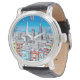 Watch in an illustration of the city of San Francisco, in bright primary colors paired with black and white line art