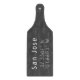 Paddle style glass cutting board with San Jose California latitude and longitude map coordinates in modern urban font on dark gray background