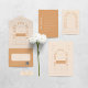 This wedding invitation design features arched typography in a funky vintage inspired font. The font has a playful and retro feel, adding a unique touch to the invitation. The color palette for the design is a golden yellow and ivory color palette, creating a warm and cheerful atmosphere. The combination of the arched typography and the vintage font gives the invitation a stylish and unique look. Overall, this wedding invitation design is perfect for couples who want to add a touch of personality and creativity to their big day.