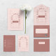 This wedding invitation design features arched typography in a funky vintage inspired font. The font has a playful and retro feel, adding a unique touch to the invitation. The color palette for the design is a rust red and light pink, creating a warm and romantic atmosphere. The combination of the arched typography and the vintage font gives the invitation a stylish and unique look, while the rust red and light pink color palette adds a trendy vibe. Overall, this wedding invitation design is perfect for couples who want to add a touch of personality and creativity to their big day.