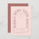 This wedding design features arched typography in a funky vintage inspired font. The font has a playful and retro feel, adding a unique touch to the invitation. The color palette for the design is a terracotta and blush pink, creating a warm and romantic atmosphere. The combination of the arched typography and the vintage font gives the invitation a stylish and unique look. Offer your guests the option to RSVP online by using your own QR code for guests to scan with their phones on the back side of this RSVP card.