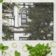 This image shows a digitally stylized, almost hand-sketched or illustrated view of the Convent building in Daylesford, partially hidden behind lush, dense foliage. The architecture is Victorian Gothic, with tall, narrow arched windows and intricate stone detailing. A central tower rises above the trees, topped with a reddish domed roof. The surrounding greenery frames the building beautifully, giving it a secretive, almost enchanted quality. The artistic effect adds swirling textures and strong black outlines, making the scene look dreamlike—like something out of a storybook or a memory.
