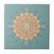 This pretty tile features a mandala in a range of colors from ecru and peach to light brown on a light turquoise background, with nature motifs.