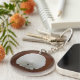 Photograph of a sand dollar on brown leather background. Design printed on both sides.