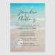 Simple and beautiful, beach-themed wedding invitation printed on a magnetic card. Sand dollar on a beach design with pretty, turquoise blue water and surf as the background for text. First names of the bride and groom are in black script at the top over a large “and” sign. The invitation is added in a paragraph to include as much info as needed, which can include reception information / address, and a reply line, with contact or wedding website. Magnetic cards cost a bit more, but the wording here means no RSVP cards are needed. Easily transfer the to any other type of paper.