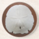 Photograph of a sand dollar on brown leather background centered on coaster.