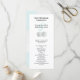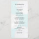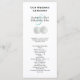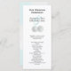 Sand dollar wedding program. Tall cards with ceremony on the front and wedding party list on the back. White with black text and two white sand dollars to represent the bride and groom. The aqua blue "&" (ampersand) matches the light blue background on the reverse side.