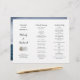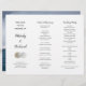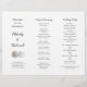 Accordion fold wedding program template with two sand dollars. The 8 x 11 inch paper is white with dark gray text in printed and script fonts. On the front, Include a title and other information about the ceremony. First names only in bolder script. Two more sections hold the “order of ceremony” and “wedding party”. All text is printed with the exception of the headings. Reverse is an image of a big crashing ocean wave. Fold accordion style after purchase - front section folds back and last section folds forward - to make a tall program that opens outward. Choose any type of paper.