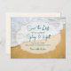 Sand and surf save-the-date postcards with custom text. Traditional wording marriage announcement for couples planning a beach destination wedding. White foamy water is washing up on a brown sandy beach and is the backdrop for calligraphy style font. On the back lines are provided for addressing, or delete them in the "customize" area.