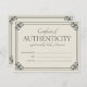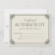 Elegant certificate of authenticity flat card in dark gray and eggshell to which you can add your name or business name inside an ornate vintage-inspired frame. Off-white certificate of authenticity flat card with elegant frames and fonts.