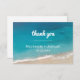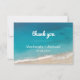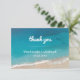 Personalized thank you note cards for a beach wedding featuring your names and wedding date in a modern retro beach town vibe font over a deep turquoise teal blue ocean and light tan sandy beach. Click 'customize further' to change fonts and text colors or design, or to add a wedding photo on the back with the advanced editor.