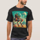 Retro-futuristic digital illustration featuring a humanoid figure in a green spacesuit with a helmet, seated in a spherical cockpit atop a red and silver robotic walker with four legs. The walker is traversing a desert-like landscape with a futuristic cityscape in the background, characterized by tall, sleek skyscrapers.