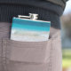 Beach themed drinking flask, with a photograph of a white sandy beach and aqua blue water. Personalize the blue text for yourself or as a great gift idea for your bridesmaids and groomsmen.
