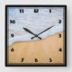 A clock with a photograph of a golden brown sandy beach with white foamy surf.