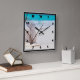 A clock with a gorgeous photograph. Tropical blue water and foamy surf in the background. A collection of seashells and stems set on a white sandy beach.