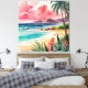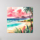 A peaceful tropical shoreline where golden sand meets rolling turquoise waves. Lush palm trees sway under a dreamy pink and teal sunset. The perfect escape for those who love the beach and ocean breeze.