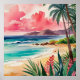 A peaceful tropical shoreline where golden sand meets rolling turquoise waves. Lush palm trees sway under a dreamy pink and teal sunset. The perfect escape for those who love the beach and ocean breeze.