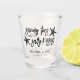 Beachy shot glasses make great favors for your destination wedding! Design features "sandy toes and salty kisses" in black lettering with two starfish. Personalize with your names and wedding date beneath.