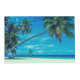 A placemat with a tropical themed photo featuring coconut palms stretching out across a secluded white sandy beach. Turquoise waters and an azure blue sky in the background.