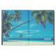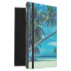 A personalized ipad case with a tropical themed photo featuring coconut palms stretching out across a secluded white sandy beach. Turquoise waters and an azure blue sky in the background.