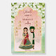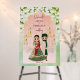 Sangeet mehndi Indian wedding welcome sign template. Cute Indian bridal couple in wedding clothes green and maroon, jasmine garlands, green and pink background.