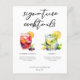 This chic signature cocktails menu features custom black typography above 2 drinks and their ingredients for your wedding bar. A cute summer Sangria and Mojito drawing add a cool flair to your bar menu. Complete with the couple's names and date for their reception.