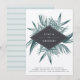 Our vintage tropical Sanibel save the date card features vintage etched style illustrations of tropical botanical leaves in rich green, with your names boldly displayed in modern lettering on an elongated diamond shaped element in charcoal gray. Add your wedding details, including date, location and wedding website, along the bottom. Cards reverse to wide horizontal stripes in tone on tone icy pale blue green. A chic look for elegant beach weddings. We recommend the Artisan Felt Ecru paper for a luxe texture and warm finish that adds a chic vintage tropical look.