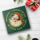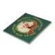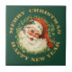 This holiday tile features a retro portrait of Santa, complete with his traditional red and white stocking cap and bushy beard. He wears a sprig of holly with a red berry. He is surrounded by a wreath of pine needles on a forest green background. Glittery gold text at the top says Merry Christmas, and at the bottom Happy New Year. *Please note - the image is printed and does not contain actual glitter.*