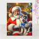 Santa and Husky Puppy with Blue Bow Card
