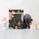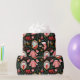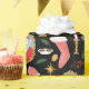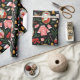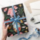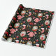 This design is a festive wrapping paper that celebrates the magic of Christmas traditions. Illustrated in a playful, painterly style, it features portraits of Santa Claus and Mrs. Claus in gilded frames, cozy holiday sweaters, stockings, candy canes, hot cocoa, candles, and evergreen sprigs—all set against a striking black background that makes the colors pop.