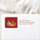 A cute illustration with the holiday spirit. Santa Claus carrying his gift sack and waving hello. His reindeer friend by his side, hanging out by a decorated Christmas tree, with presents all around. Set on a red background with whimsical circles. Festive and cheerful design.