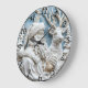 In a delightful winter wonderland, Santa Claus holds a shimmering ornament, accompanied by a majestic reindeer. Surrounding them are snow-capped trees and intricate clock designs capturing the magic of the holiday season, evoking warmth and cheer.