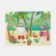 This Christmas holiday beach doormat features cute and colorful tropical birds wearing Santa hats. They are walking on the beach to meet Santa under a palm tree decorated with ornaments and lights.