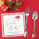 Cute Christmas holiday season baby shower napkins with "Santa Baby" written in an elegant script with a heart swash and a watercolor illustration of a red Santa Claus hat. Personalize with the mother's name and shower date in simple modern typography.