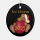 Baby's first Christmas keepsake ornament featuring a teddy bear in a red stocking cap holding a big red tree ball! You can add baby's name, date and time of birth, height and weight, and the current year to this fully customizable keepsake holiday ornament.