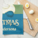Our Santa Christmas kitchen towel has turquoise blue and white polka dots with green stripes and a place for your family name or any message. Add a bit of holiday cheer to your holiday kitchen. Mix and match for a fun look for your holiday home decor.