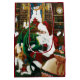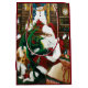 Santa with a young green dragon on his lap. Santa's den is filled with a bag of toys, baby griffin, baby white unicorn and two cats in book shelves. In behind is a fireplace, bookshelves filled with books and tapestry of a snowman