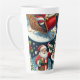 This festive latte mug captures the joyful essence of Santa Claus and Christmas. The design features Santa Claus in his iconic red suit, holding a sack of gifts, with a warm, jolly smile. Surrounding him are playful details like candy canes, golden bells, and holly leaves. The background showcases a snowy village scene, complete with twinkling lights and cozy cottages, under a starry night sky.